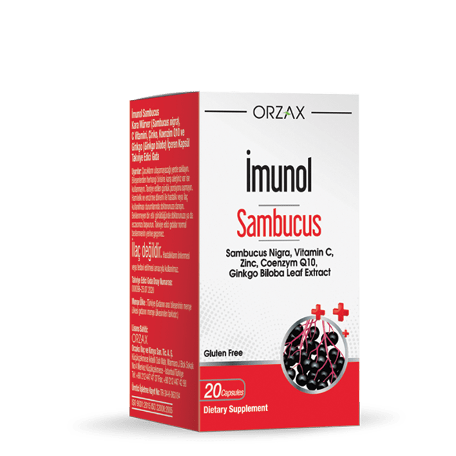 Imunol Sambucus Capsule содержит экстракт черной бузины, витамин С, цинк, экстракт листьев гинкго билоба и кофермент Q10.