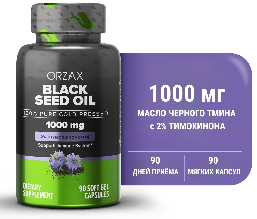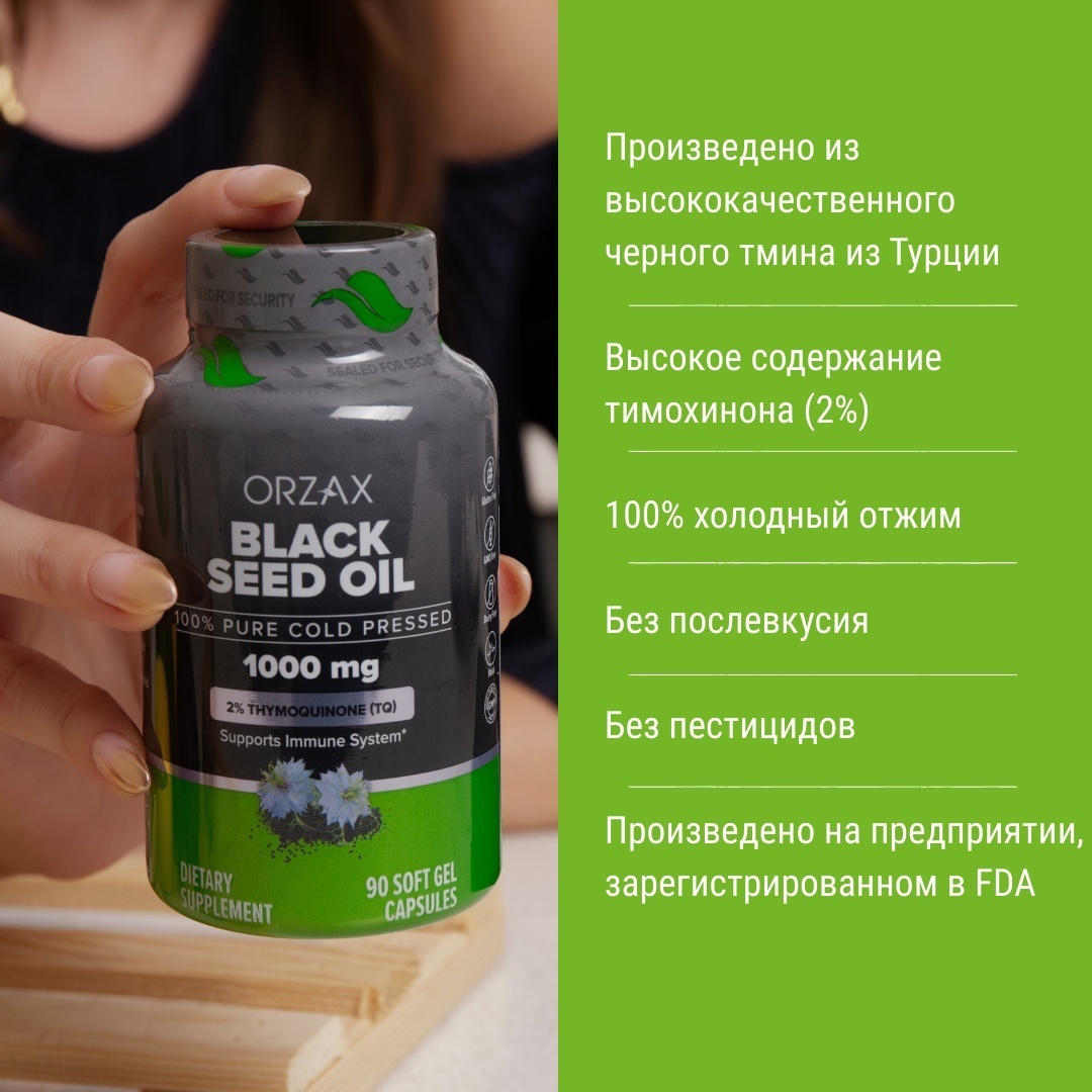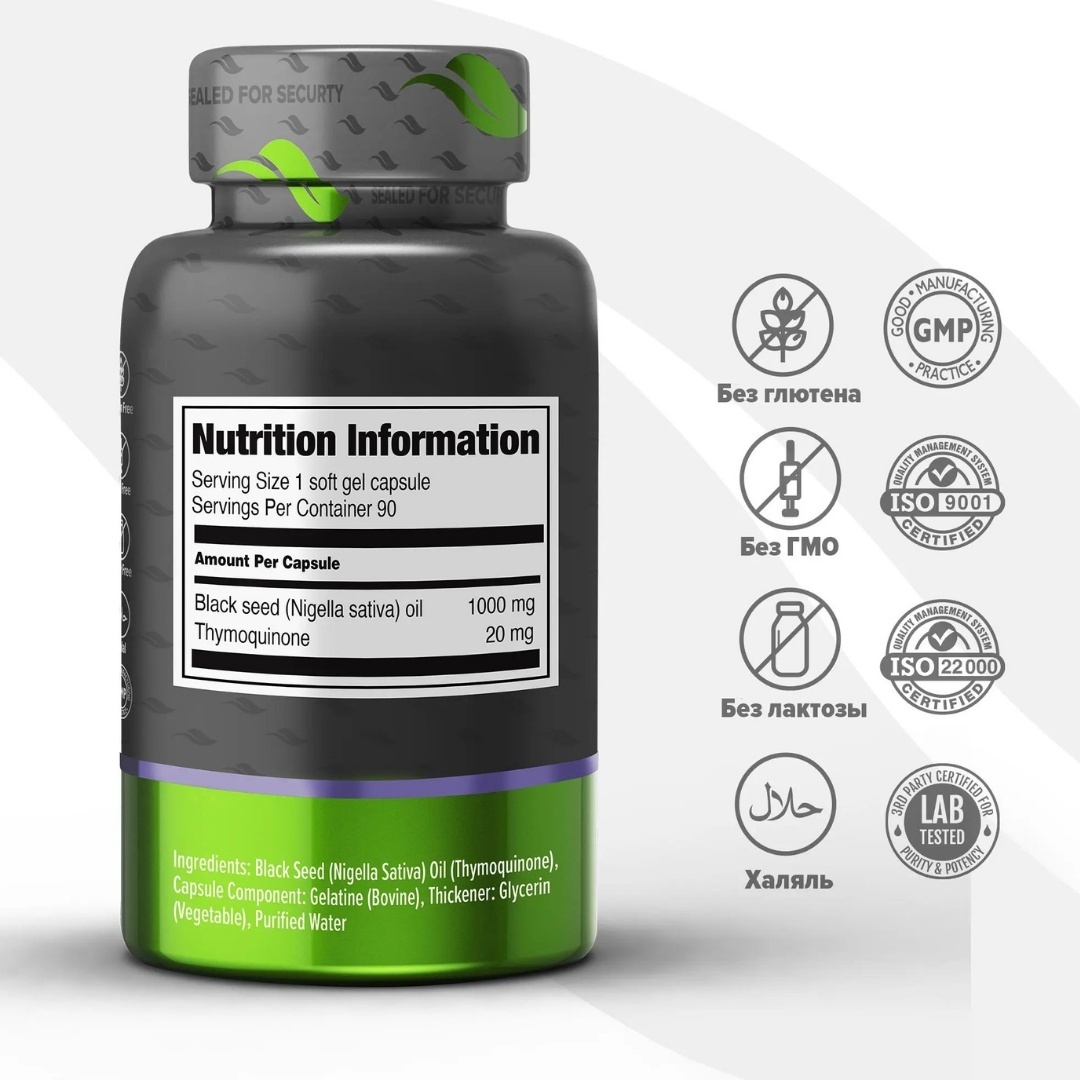 • Каждая капсула содержит 1000 мг масла черного тмина холодного отжима и 20 мг тимохинона, а также антиоксиданты.
