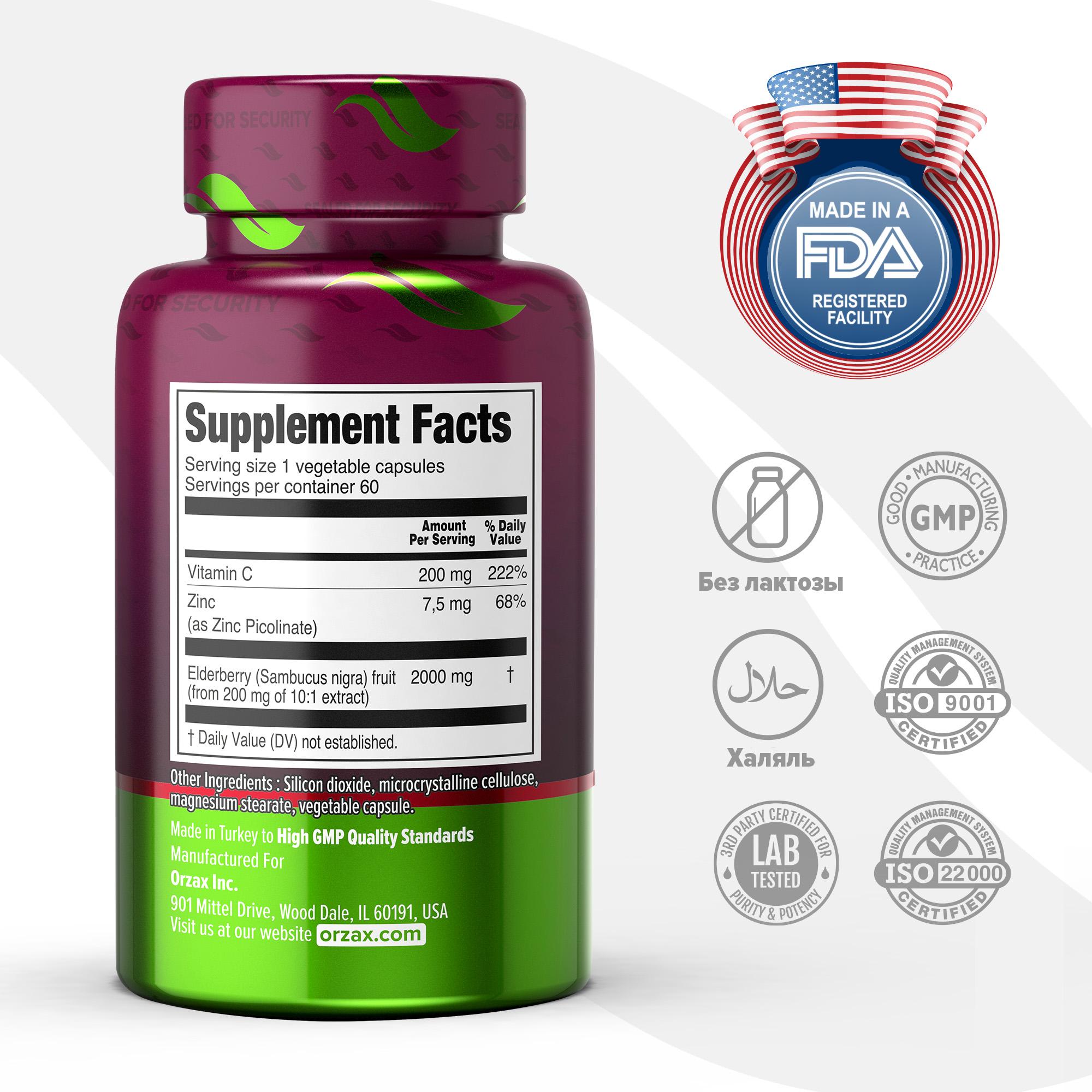 Дозировка в 1 капсуле: Экстракт бузины — 2000 мг, Витамин С — 200 мг, Цинк — 7,5 мг